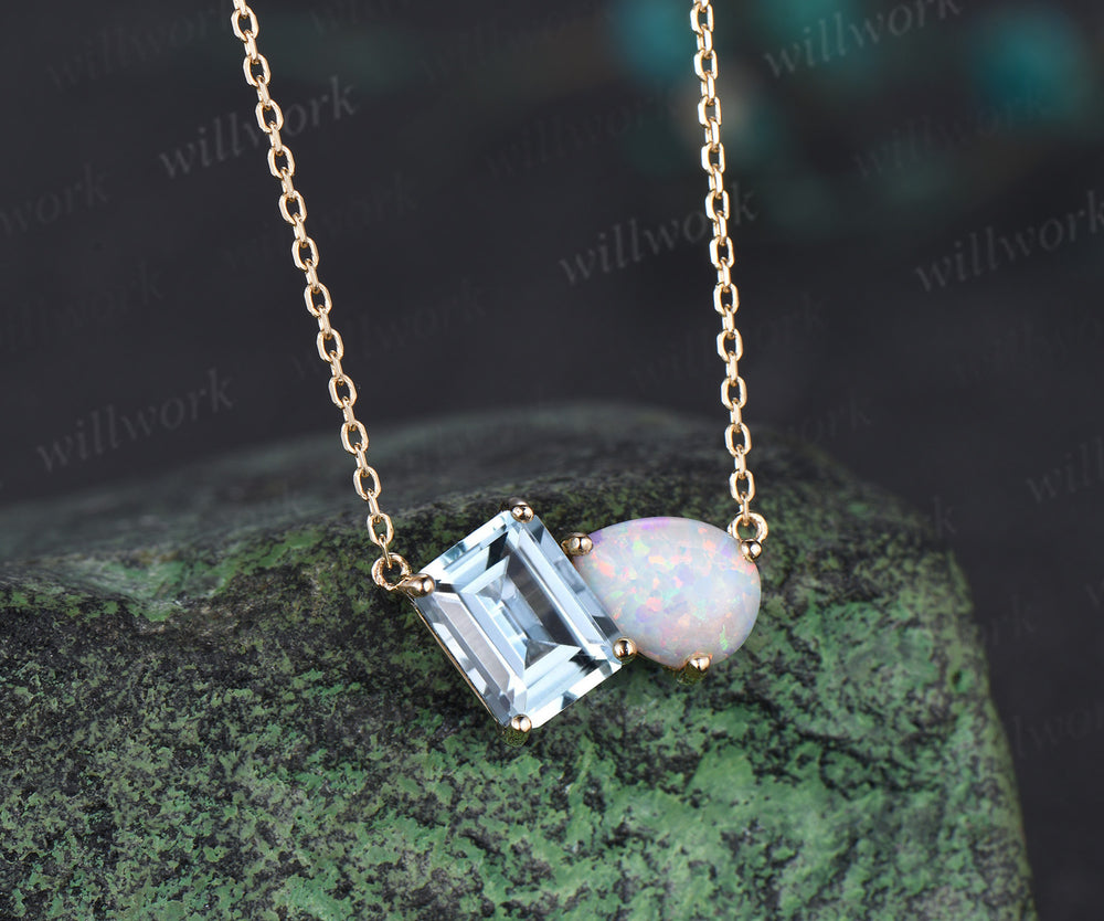 Emerald cut aquamarine and pear opal necklace 14k yellow gold two stone pendant women dainty anniversary gift mother