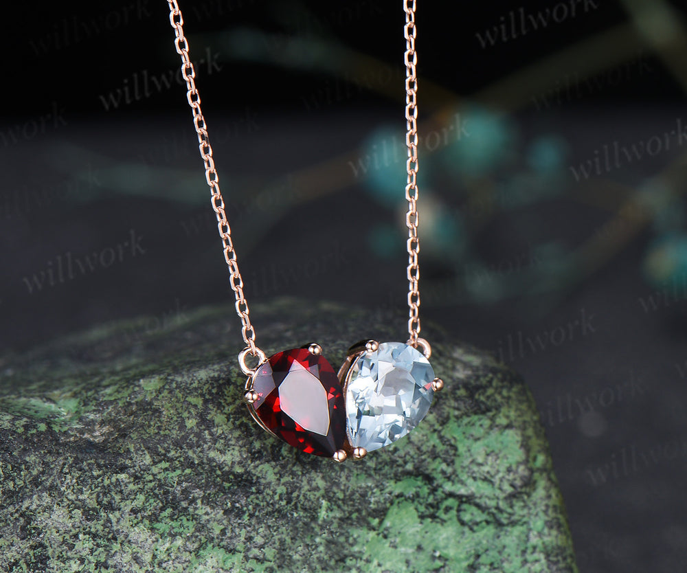 Pear garnet aquamarine necklace heart shape pendant Toi et Moi necklace minimalist birthstone necklace unique gifts