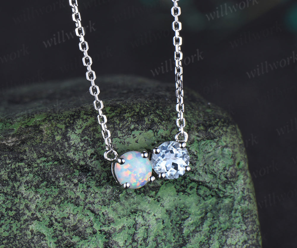 Two stone round cut opal aquamarine Necklace solid 14k 18k white gold Pendant dainty gift