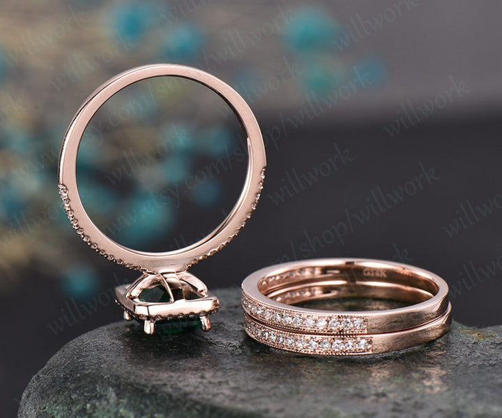 3pcs diamond halo ring emerald cut emerald engagement ring set rose gold May birthstone stacking vintage unique bridal wedding ring set gift