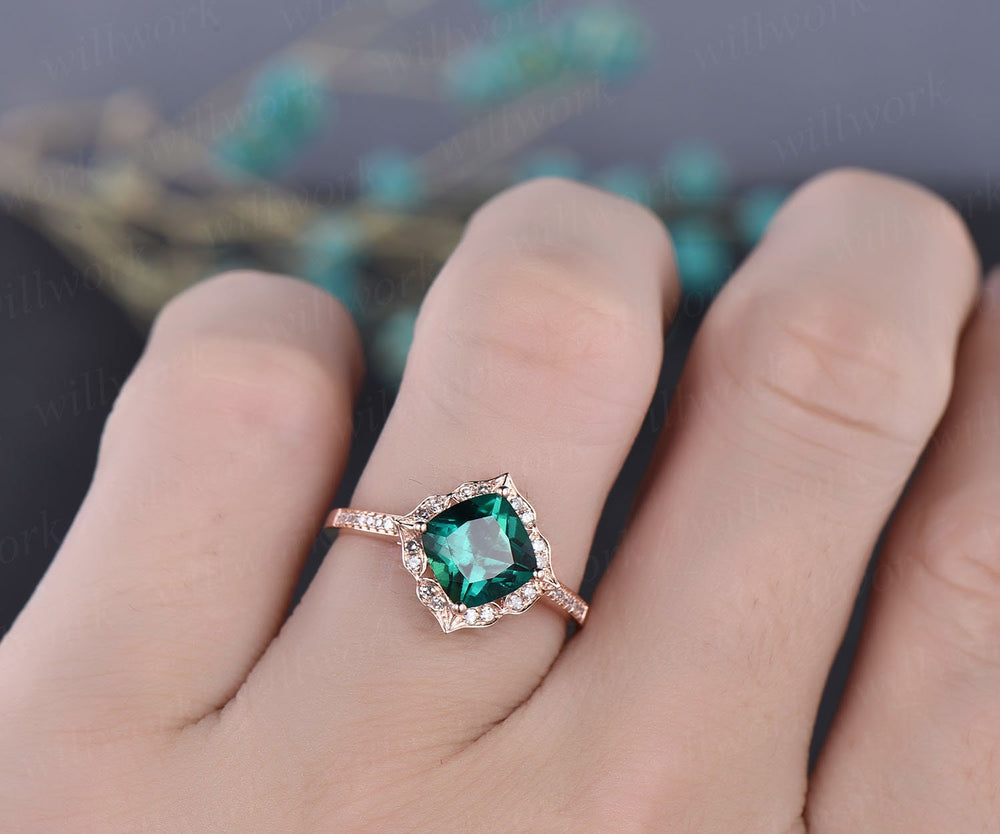 Flower cluster diamond halo ring green emerald engagement ring rose gold cushion emerald ring vintage antique May birthstone wedding ring
