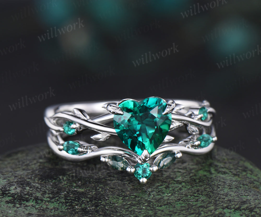 Vintage heart green emerald engagement ring set 14k white gold leaf branch moss agate ring women unique wedding anniversary gift