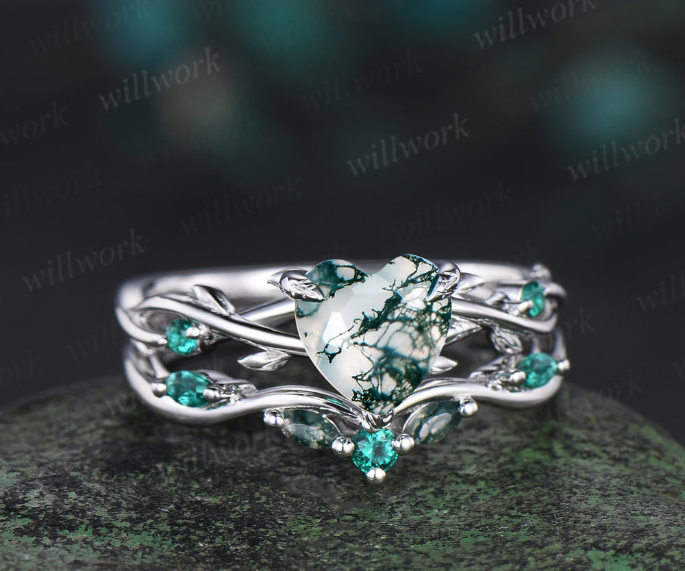 Vintage heart moss agate engagement ring set 14k white gold leaf branch moss agate ring women unique wedding anniversary gift