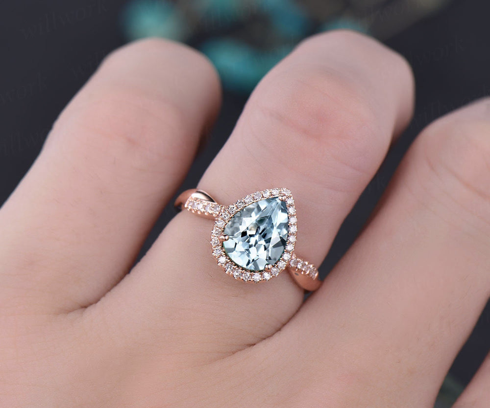 7x9mm pear aquamarine engagement ring rose gold vintage infinity diamond halo ring March birthstone gift women bridal wedding ring jewelry