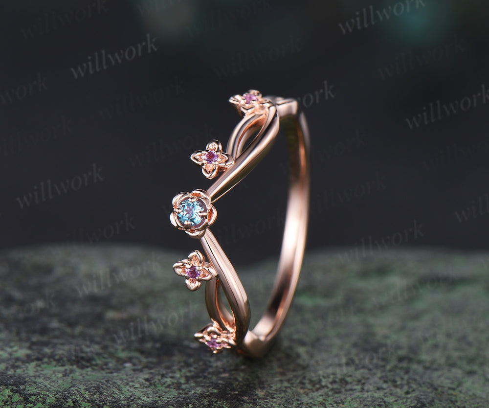 Floral Alexandrite amethyst wedding band five stone infinity stacking ring women 14k rose gold gift