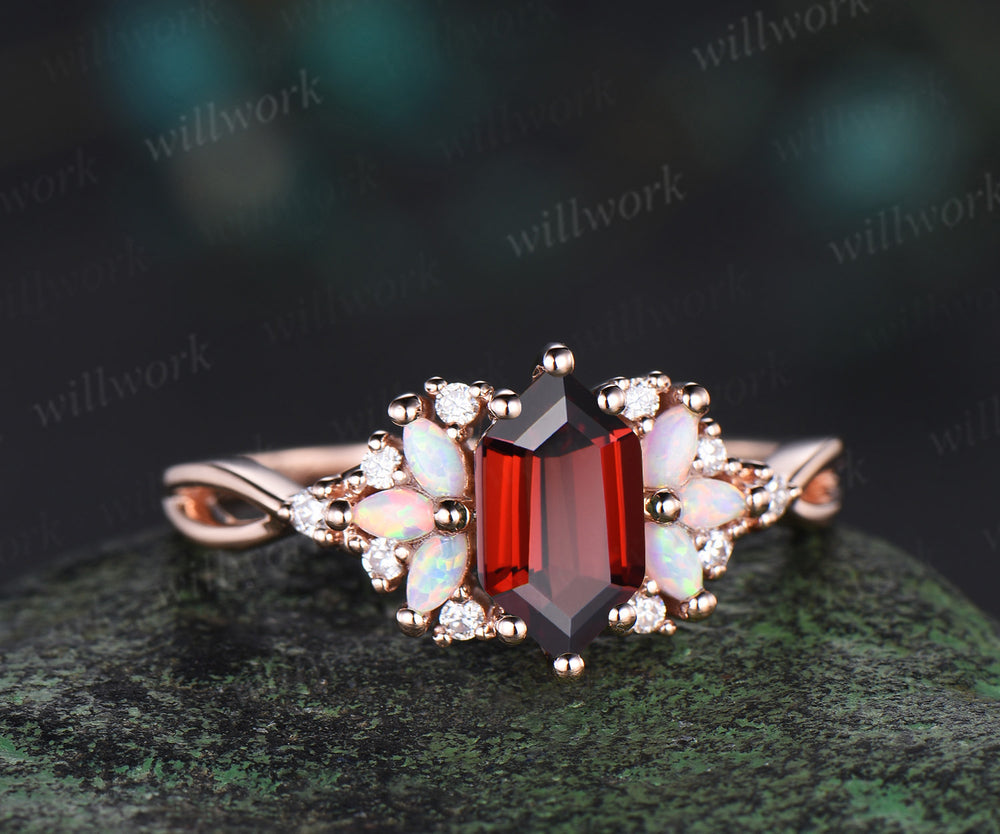 Long Hexagon cut garnet engagement ring rose gold women cluster opal diamond unique promise ring her infinity anniversary gfit