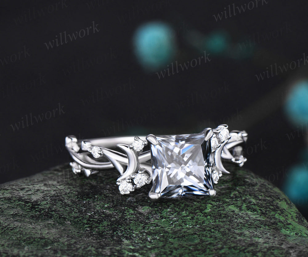 Princess cut gray moissanite ring vintage white gold diamond unique vine branch moon engagement ring infinity promise anniversary ring women gift