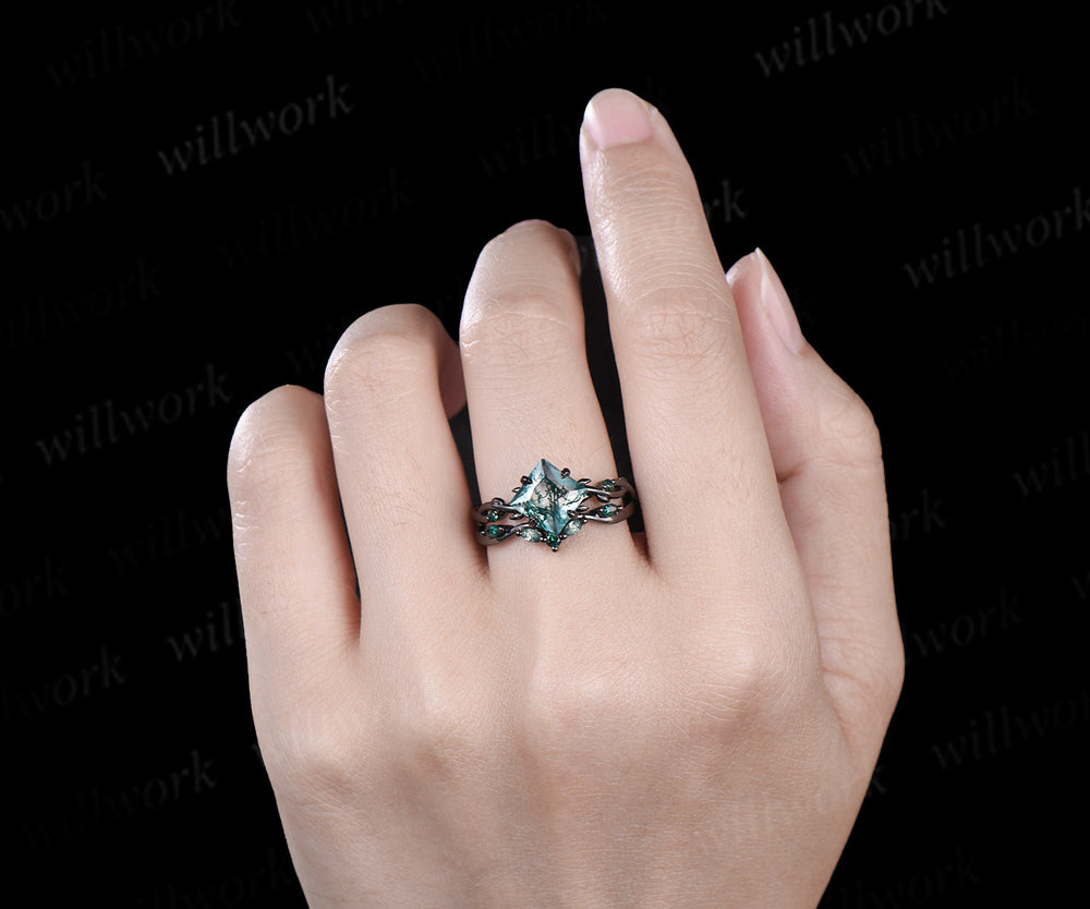 ***Beneath a canopy of midnight forest, this princess cut moss agate glows like captured moonlight. Set in black gold with intertwining twig and leaf accents, the ring's curved band embraces it in an eternal infinity. A mystical, nature-inspired bridal set for the wildly romantic heart.***- Metal: Solid gold(10K/14K/18K white/yellow/rose gold),925 sterling silver,platinum available