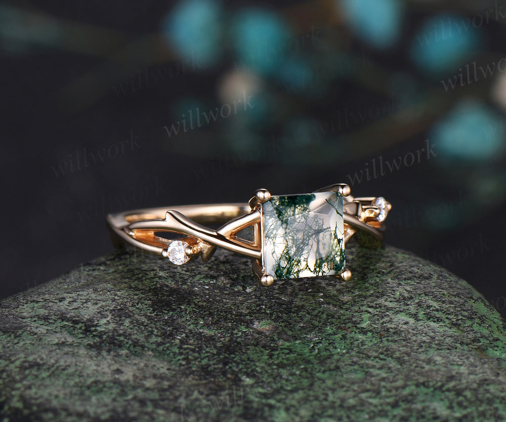 Princess cut moss agate ring yellow gold diamond twig branch three stone vintage engagement ring infinity anniversary ring women gift