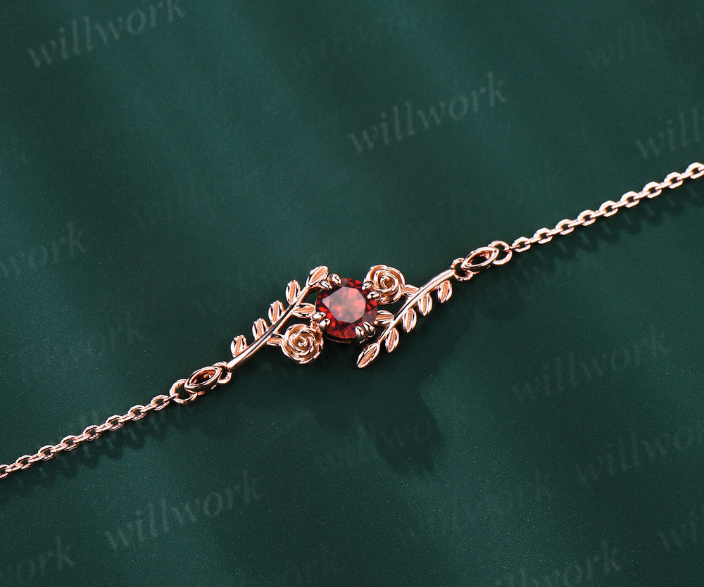 Branch Leaf Round Natural Garnet Bracelet 14k Rose Gold Floral Wedding Bracelet Nature Inspired Rose Flower Bracelet Proposal Gift for Women