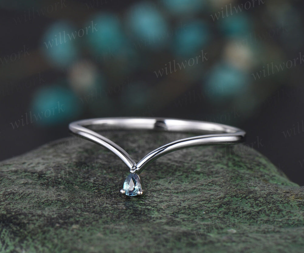 Curved pear cut alexandrite wedding band solid 14k white gold Solitaire stacking matching anniversary ring gift