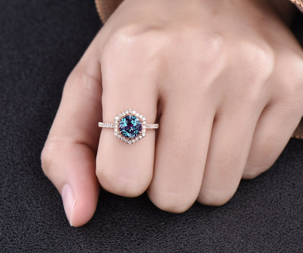 Hexagon halo diamond ring 7mm round shaped Alexandrite engagement ring rose gold ring for women jewelry unqiue wedding ring bridal ring gift