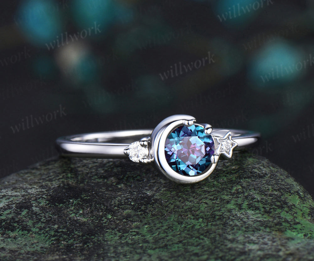 Round cut alexandrite ring white gold three stone diamond ring women vintage unique star moon engagement ring dainty anniversary gift