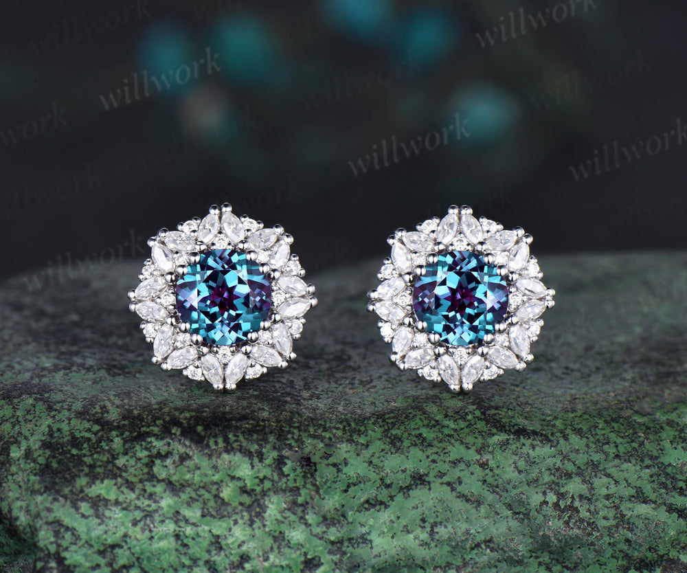 Vintage round cut Alexandrite Earrings women solid 14k white gold 8 prong double halo marquise moissanite Stud Earrings Anniversary Gift