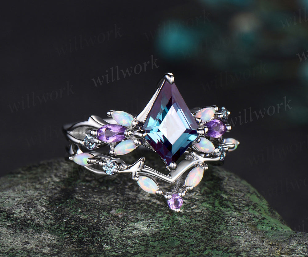 Vintage Kite Alexandrite Engagement Ring Set White Gold Vines Amethyst Opal Ring Women Bridal Set Unique Twig Anniversary Promise Ring Gift