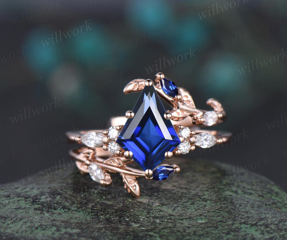 Vintage kite cut blue sapphire engagement ring leaf stacking rose gold diamond wedding promise ring set women jewelry