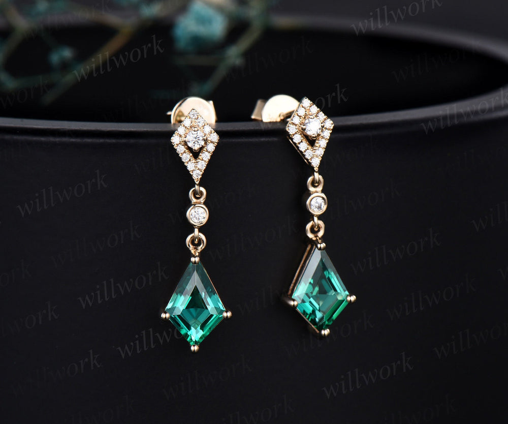 Vintage kite cut green emerald earrings solid 14k yellow gold halo diamond drop earrings women May birthstone dainty anniversary gift her