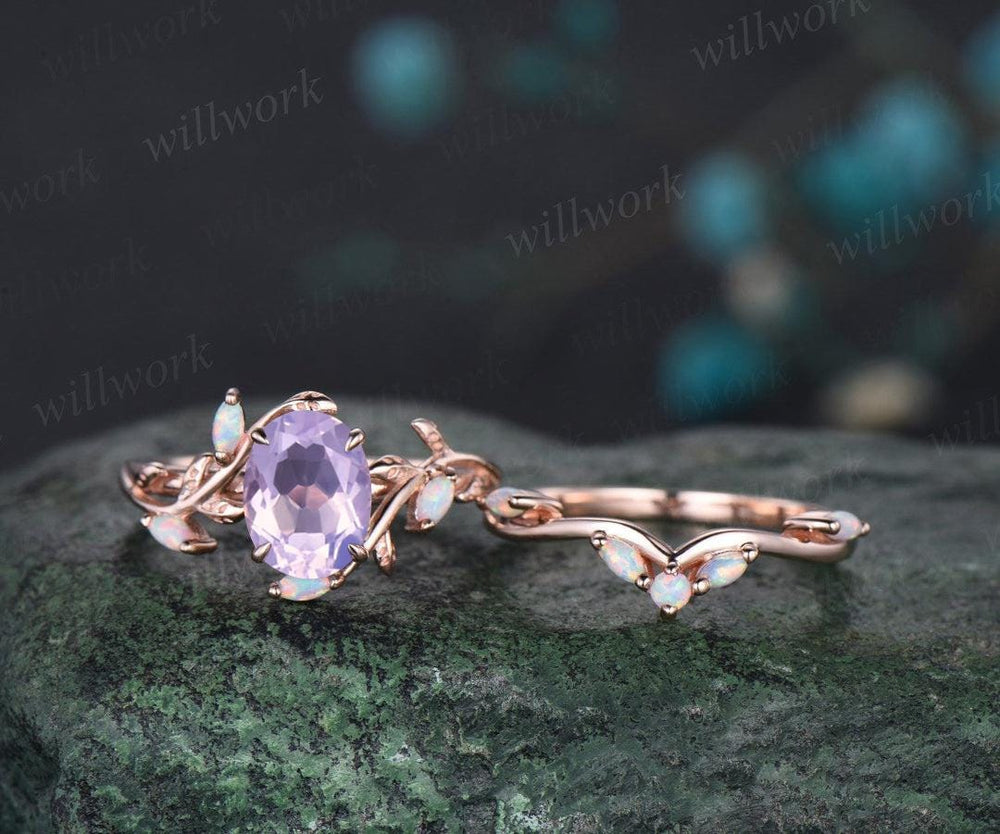Oval cut Lavender Amethyst ring vintage five stone opal ring rose gold leaf nature inspired engagement ring crystal wedding ring set women
