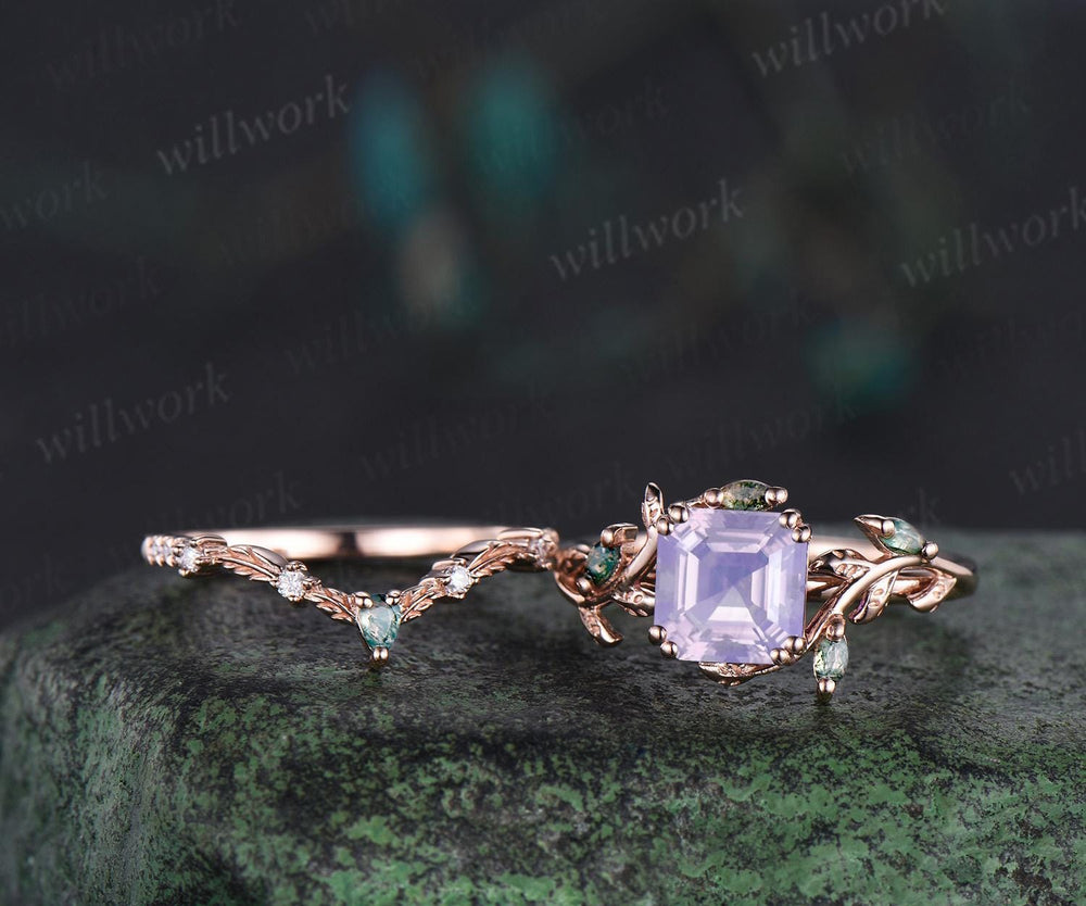 Vintage Asscher cut Lavender Amethyst engagement ring set 14k rose gold cluster leaf nature inspired moss agate bridal ring set women gift