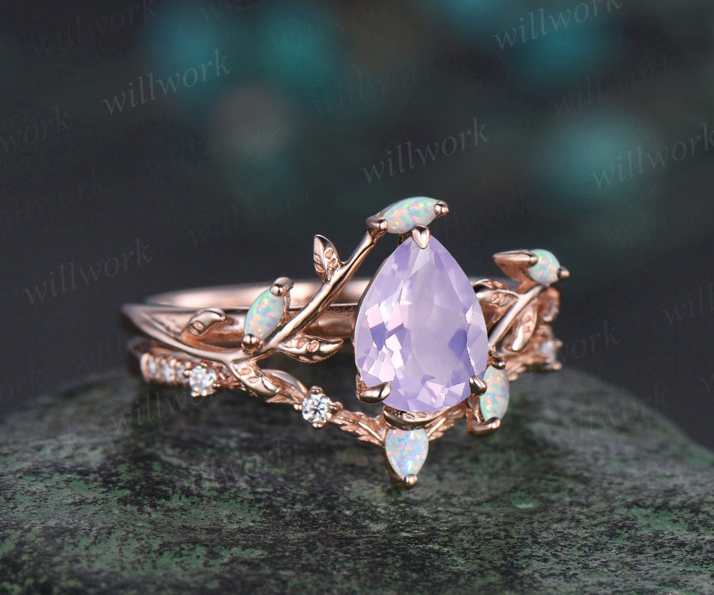 Vintage pear cut Lavender Amethyst engagement ring rose gold Crystal nature inspired leaf opal stacking bridal anniversary ring set women