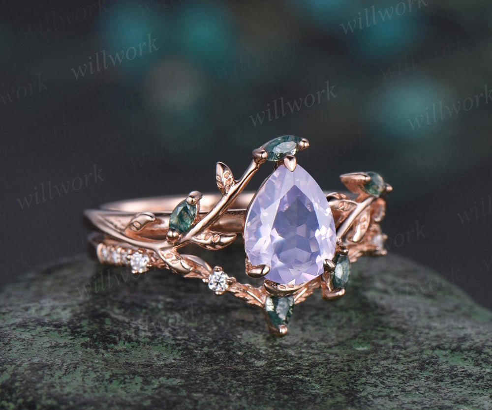 Vintage pear cut Lavender Amethyst engagement ring set rose gold art deco cluster leaf nature inspired moss agate bridal wedding ring women