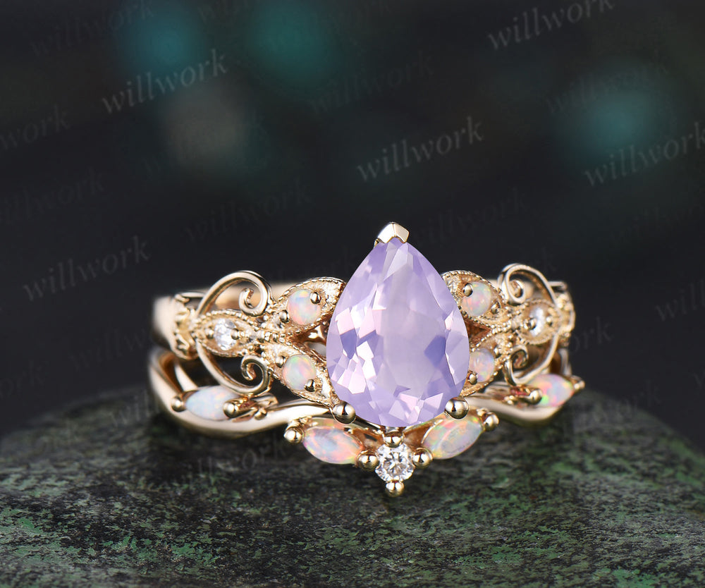 Vintage pear Lavender Amethyst engagement ring set yellow gold butterfly Milgrain opal ring women stacking anniversary ring set gift Vintage pear Lavender Amethyst engagement ring set yellow gold butterfly Milgrain opal ring women stacking anniversary ring set gift $281.00