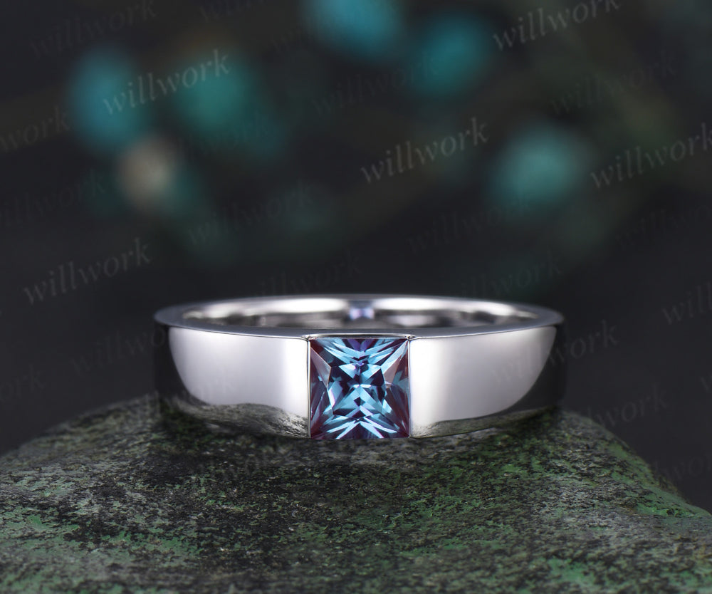Princess Cut Color-Change Alexandrite mens Wedding Band solid 14k white gold Color-Change Gemston Unique Anniversary Gifts men