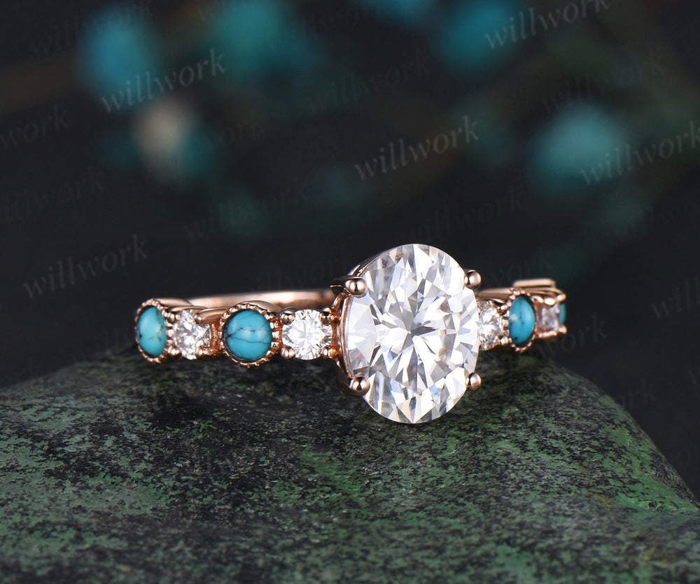 2ct Unique Oval Moissanite Half Eternity Engagement Ring Vintage Round Bezel Turquoise rose gold Art Deco Bridal Ring Anniversary Gift
