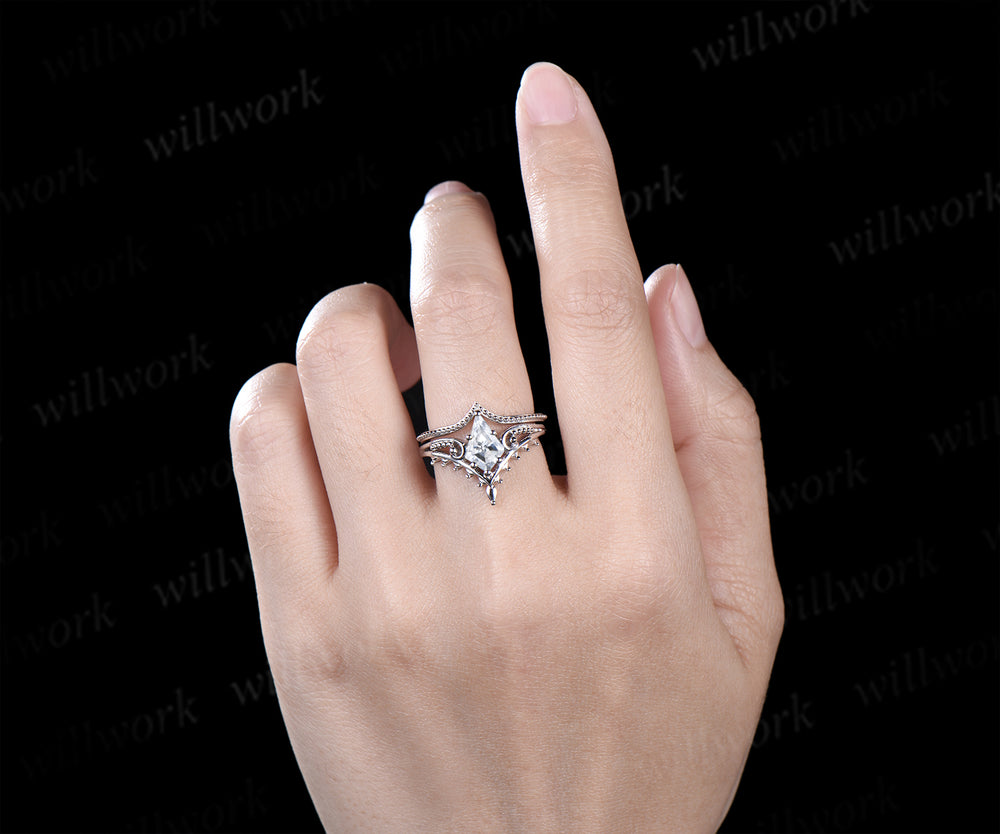 Kite cut moissanite ring set white gold retro solitaire filigree ring half eternity milgrain band unique bridal set gift for her