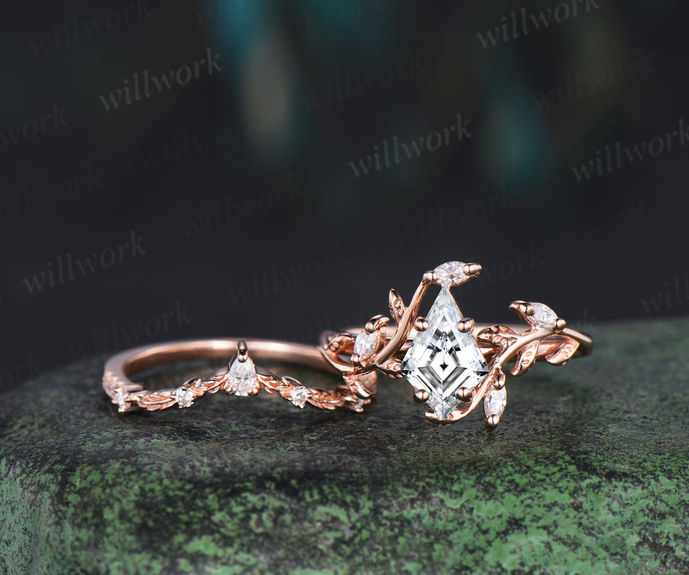 Vintage kite cut moissanite engagement ring 14k rose gold leaf nature inspired ring women unique cluster diamond promise wedding ring set