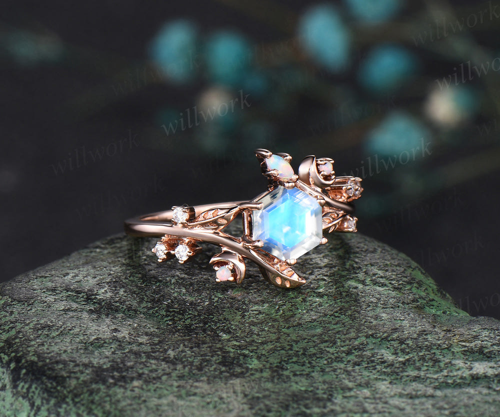 Hexagon cut moonstone engagement ring rose gold twisted leaf moon diamond ring vintage June birthstone anniversary ring women