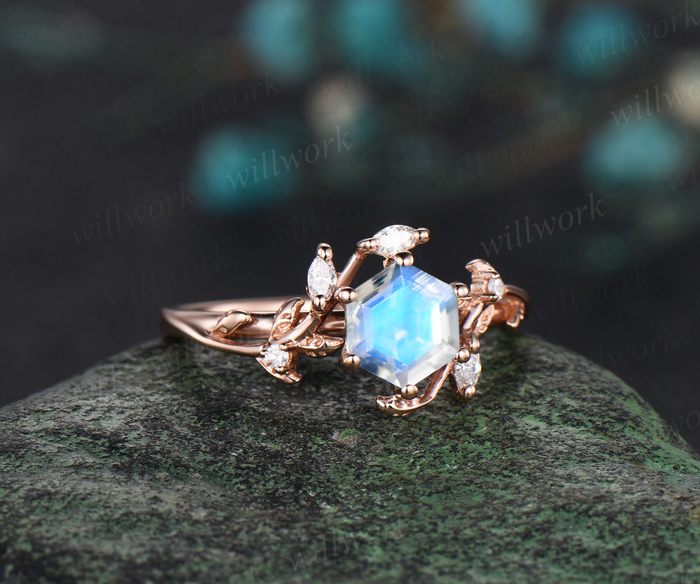 Hexagon cut moonstone ring rose gold vintage leaf nature inspired cluster engagement ring twisted diamond wedding ring gift