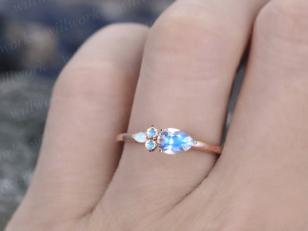 Pear shaped moonstone ring vintage five stone East To West unique engagement ring 14k rose gold dainty opal ring women anniversary ring gift