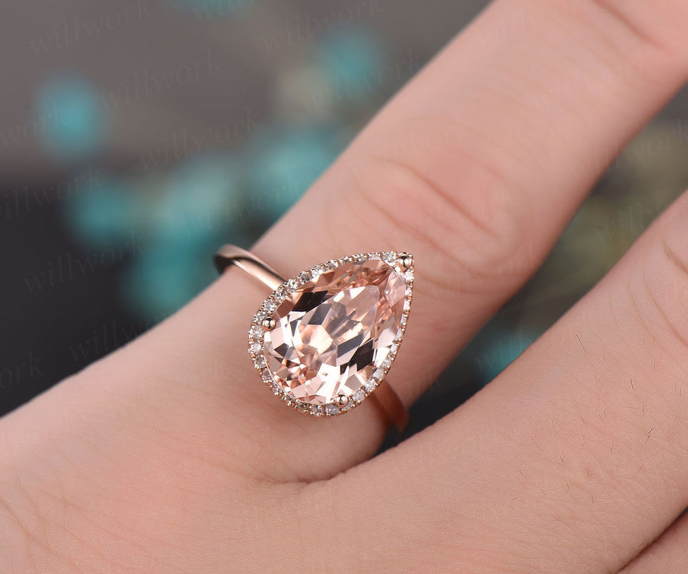 8x12mm pear morganite engagement ring rose gold morganite ring diamond halo ring antique unique bridal wedding promise ring gift for her