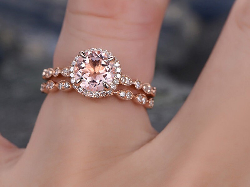 Morganite engagement ring set solid 14k rose gold handmade diamond halo ring 2pc stacking round marquise wedding promise anniversary ring