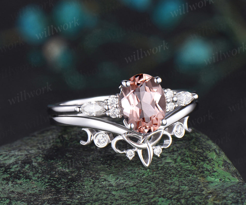 Oval cut morganite engagement ring solid 14k white gold moon Celtic knot diamond wedding promise ring set women