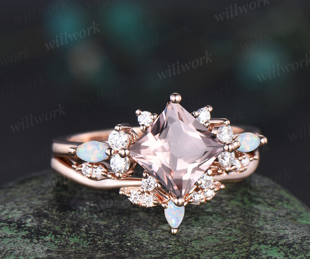Pincess cut morganite engagement ring set cluster diamond rose gold opal ring women stacking promise wedding ring set