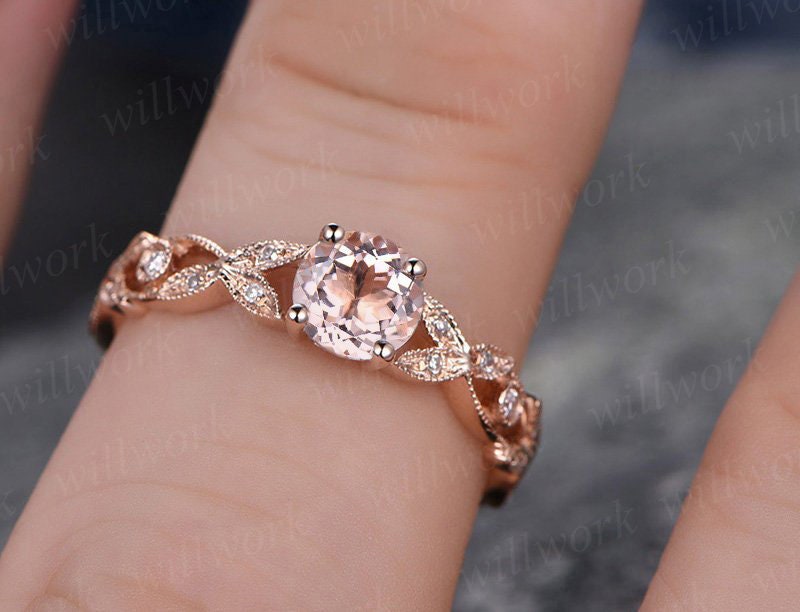 Pink morganite engagement ring-Solid 14k Rose gold-handmade full eternity diamond ring-5mm Round cut gemstone promise ring-Art Deco ring