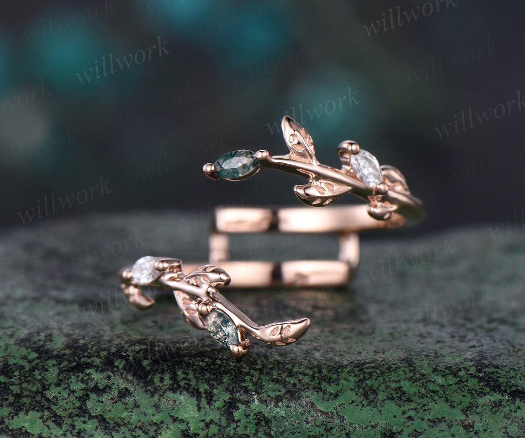 Vintage kite cut moss agate engagement ring leaf stacking enhancer rose gold diamond wedding promise ring set women