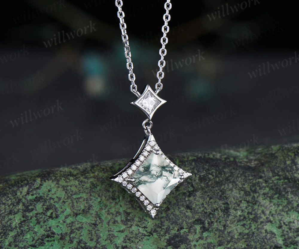 Princess Cut moss agate diamond Halo Pendant Necklace Solid 14k White Gold Square Shape Drop Necklace