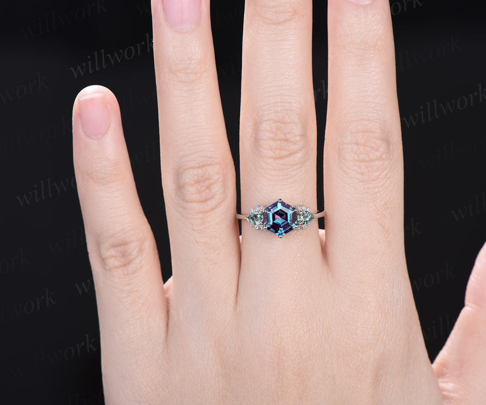Hexagon Alexandrite ring white gold pear moss agate ring 6 prong cluster diamond ring unique engagement ring women anniversary ring gift