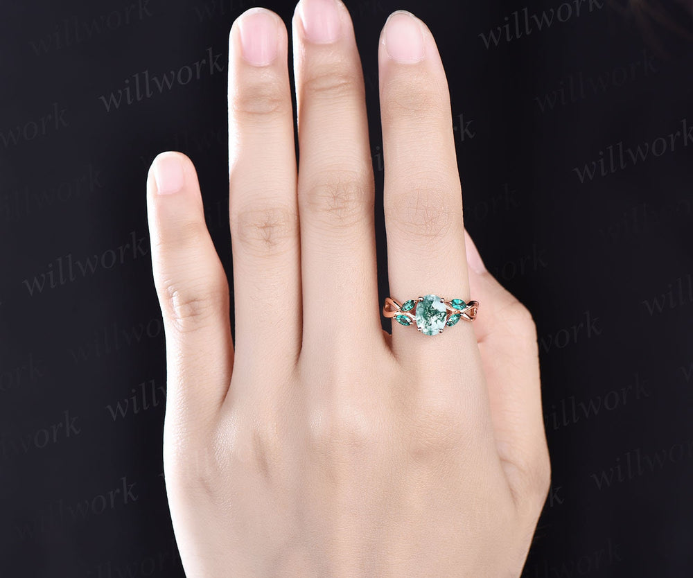 Oval moss agate engagement ring rose gold vintage unique engagement ring dainty marquise cut emerald twisted ring anniversary promise ring