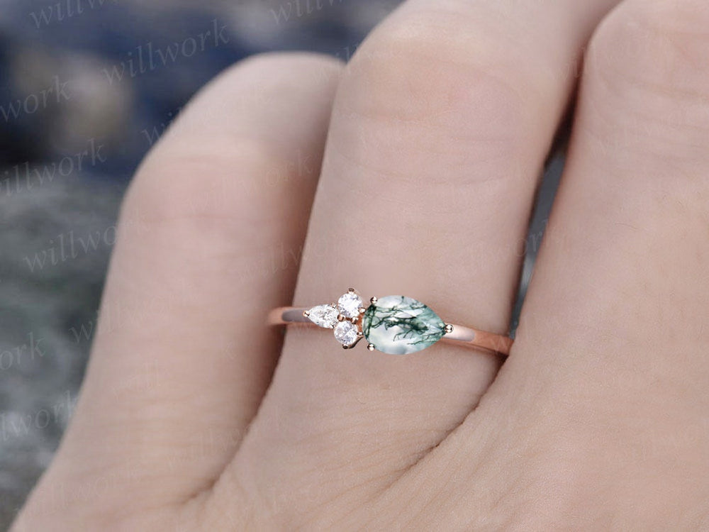 Pear shaped green moss agate ring vintage dainty engagement ring women rose gold 4 stone moissanite ring unique bridal wedding promise ring
