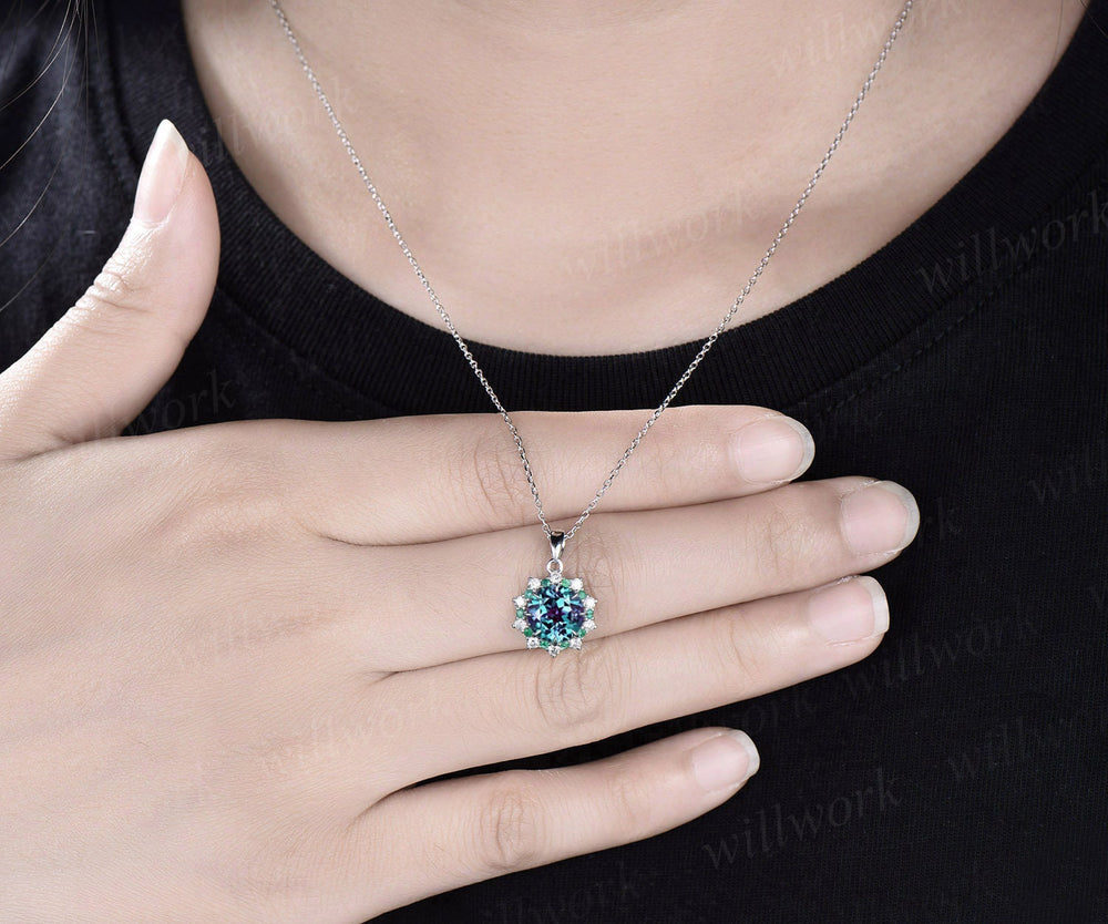 Vintage 2ct round cut alexandrite necklace white gold 8 prong halo natural emerald diamond pendant women June birthstone promise bridal gift