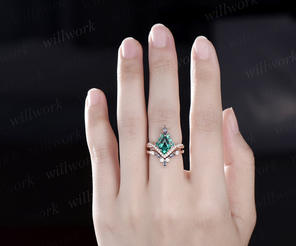 Vintage kite green emerald engagement ring set rose gold art deco alexandrite emerald ring women twisted halo diamond bridal promise ring