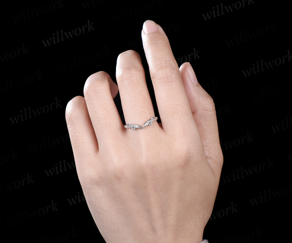 Nature inspired alexandrite leaf wedding band curved V-shaped vintage stacking ring birthstone anniversary ring