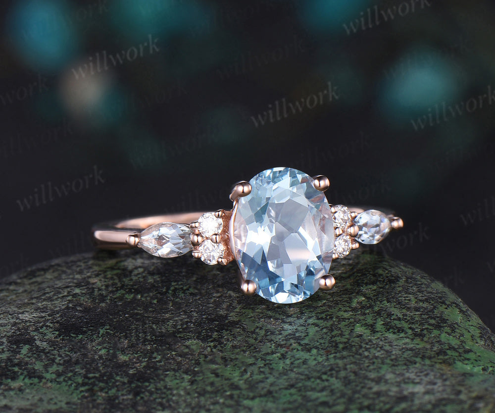 Oval cut aquamarine engagement ring solid 14k rose gold diamond ring March birthstone unique promise wedding ring women