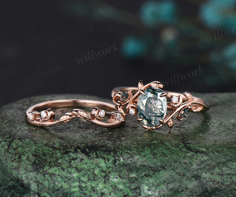 Oval cut moss agate ring vintage 14k rose gold diamond leaf branch moon engagement ring women stacking wedding ring set gift