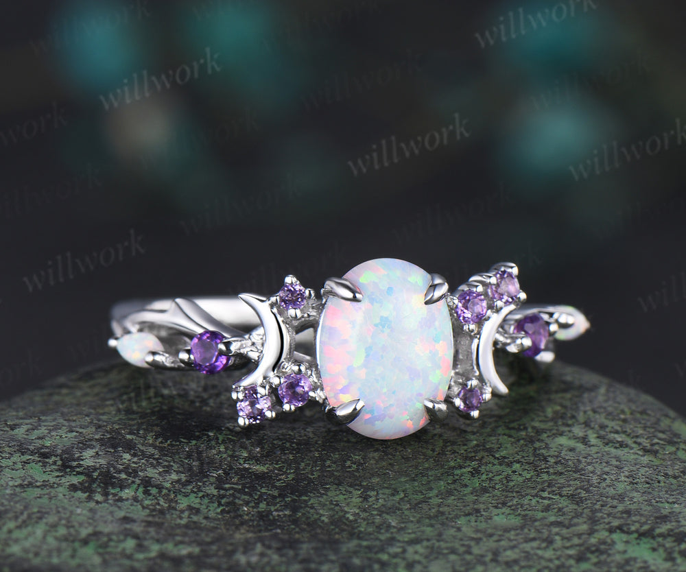 Oval Opal Engagement Ring Vintage Opal Moon Engagement Ring Branch Cluster Amethyst Wedding Ring Promise Gift For Women