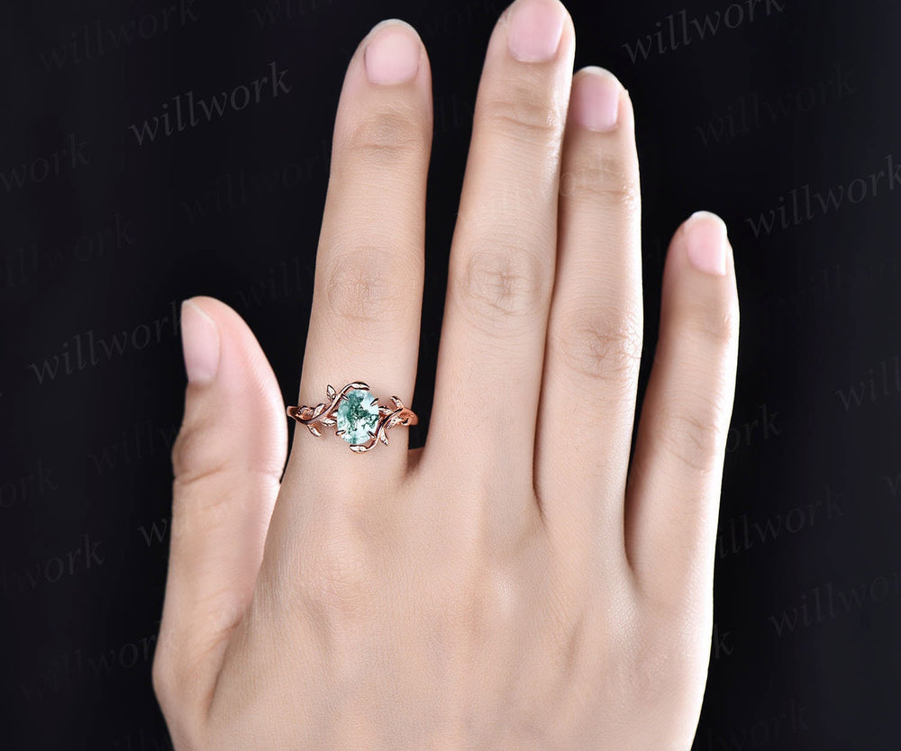 Unique vintage green moss agate engagement ring leaf flower art deco dainty solitaire rose gold ring promise bridal weddring ring jewelry